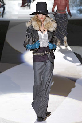 The old west serves as inspiration for DSquared2′s fall 2011 presentation with flannel, denim and lace-up boots taking over the runway. Adding to the pioneering effect, models were sprinkled with snow as they took the catwalk in floppy hats, fringe and leather gloves.